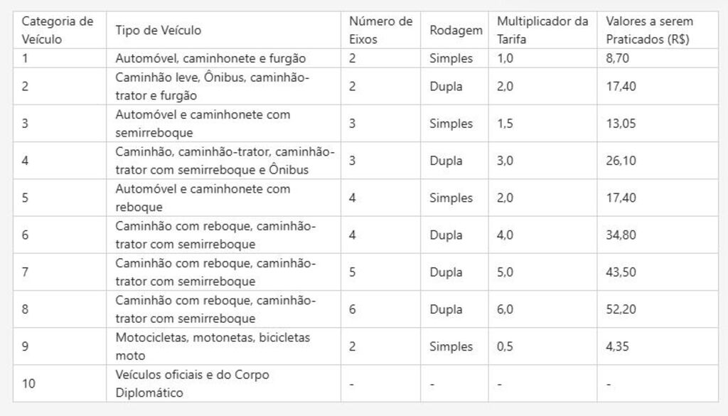 A nova tarifa básica de R$ 8,70 foi autorizada pela ANTT, e será aplicada nas cinco praças de pedágio da concessionária