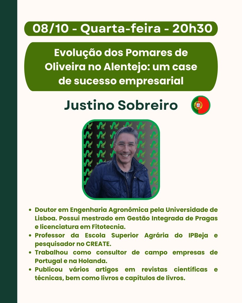 Atualmente, é professor na Escola Superior Agrária do Instituto Politécnico de Beja - IPBeja e pesquisador no Centro de Investigação Científica e Tecnológica em Sistema Terrestre e Energia. Justino Sobreiro possui vasta experiência no setor privado, atuando como consultor de campo para empresas portuguesas. No SEMIARE ele apresentará a palestra “Evolução dos Pomares de Oliveira no Alentejo: um case de sucesso empresarial”.