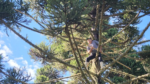 É o caso de João Odilar de Oliveira, que desde criança sobe até o topo de enormes araucárias para derrubar as pinhas e, assim, garantir renda para os próximos meses.