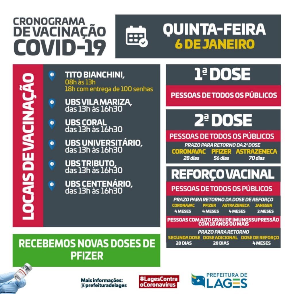 A imunização contra uma Covid-19 em Lages tem sua continuidade nesta quinta-feira (6 de janeiro). Uma nova remessa de doses da Pfizer chega ao município na noite desta quarta-feira (5) o que possibilitará o andamento do esquema vacinal completo.