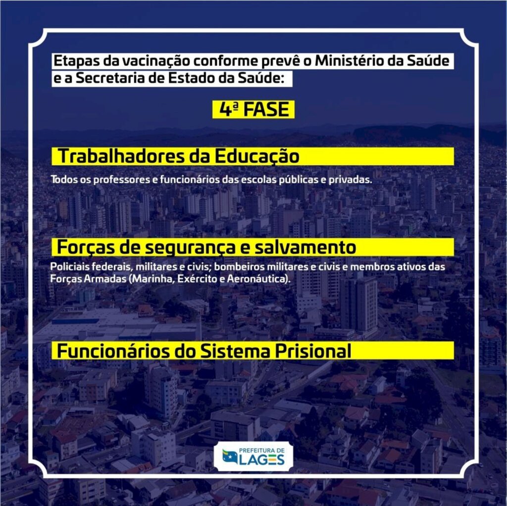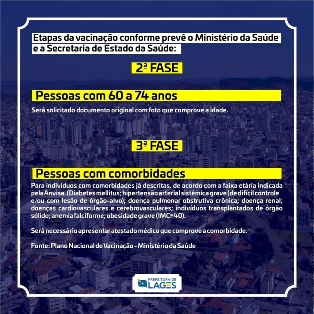 Na primeira fase, a previsão é imunizar, em Lages, aproximadamente 12 mil pessoas dos grupos prioritários definidos pelo Ministério da Saúde e Secretaria de Estado da Saúde. O município tem estoque de seringas e agulhas, por conta do planejamento que iniciou em setembro do ano passado.