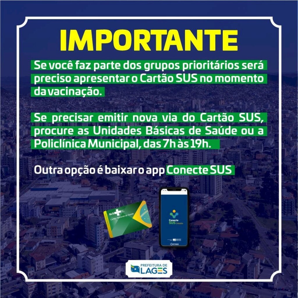 Se você está nos grupos prioritários para vacinação e, porventura precisa emitir nova via do Cartão SUS, poderá procurar as Unidades Básicas de Saúde ou a Policlínica Municipal, das 7h às 19h, de segunda a sexta-feira, ou baixar o documento gratuitamente no aplicativo para celular Conecte SUS.