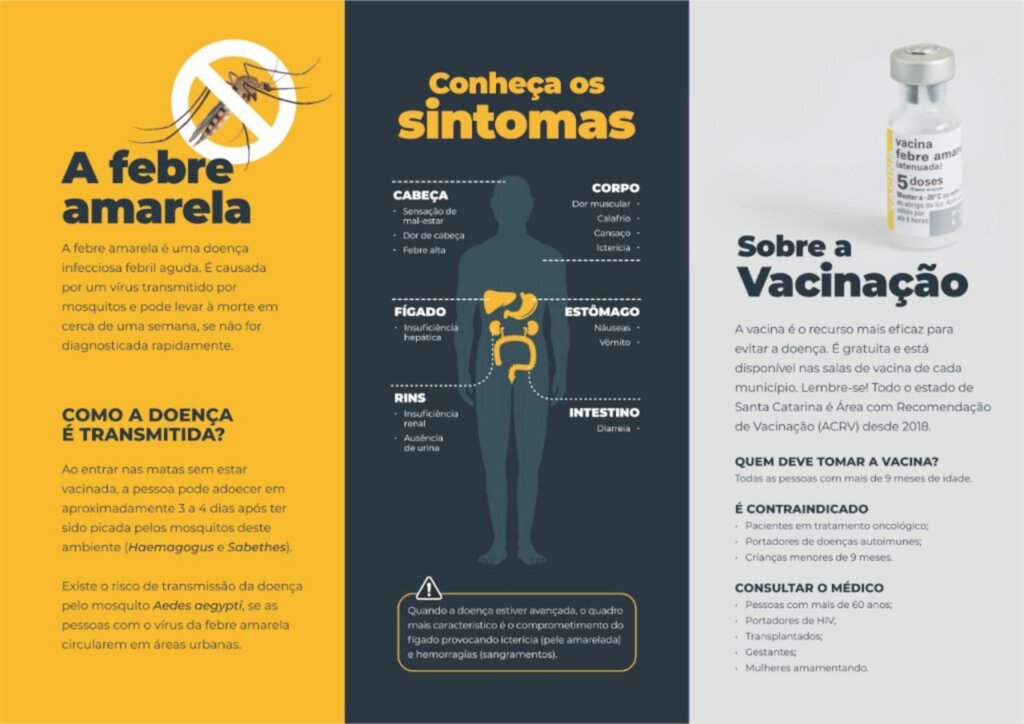 A Diretoria de Vigilância Epidemiológica do Estado de Santa Catarina (Dive/SC) divulgou, na quarta-feira (27 de janeiro), a confirmação do primeiro caso de febre amarela em humano deste ano. A paciente é uma mulher, de 40 anos, moradora da cidade de Taió, Alto Vale do Itajaí, que não tinha registro de vacina contra a doença.