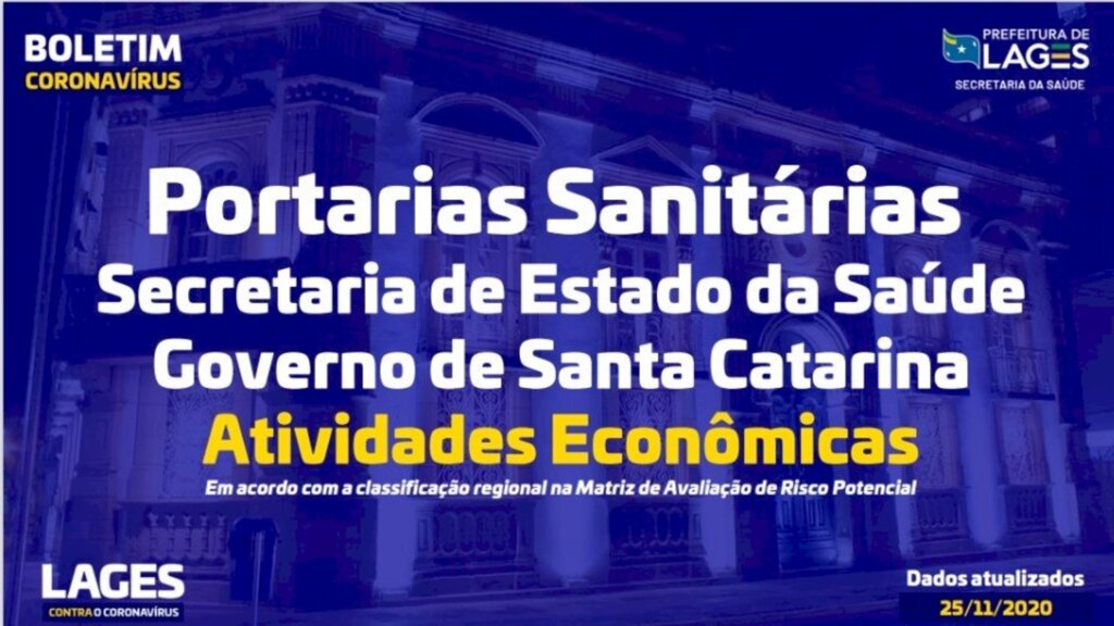 A Prefeitura de Lages, por meio da Secretaria Municipal da Saúde, recebeu oficialmente na manhã de quarta-feira (25 de novembro), a atualização da Matriz de Risco Potencial do Governo do Estado de Santa Catarina. O documento informa que a Serra Catarinense e outras 12 regiões se encontram na classificação Vermelha (Risco Gravíssimo). Outras três regiões, Extremo Oeste, Alto Uruguai Catarinense e Foz do Rio Itajaí estão enquadradas na cor Laranja (Risco Grave).