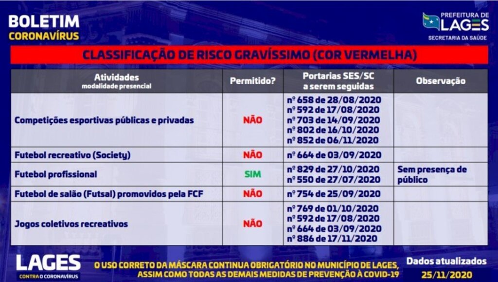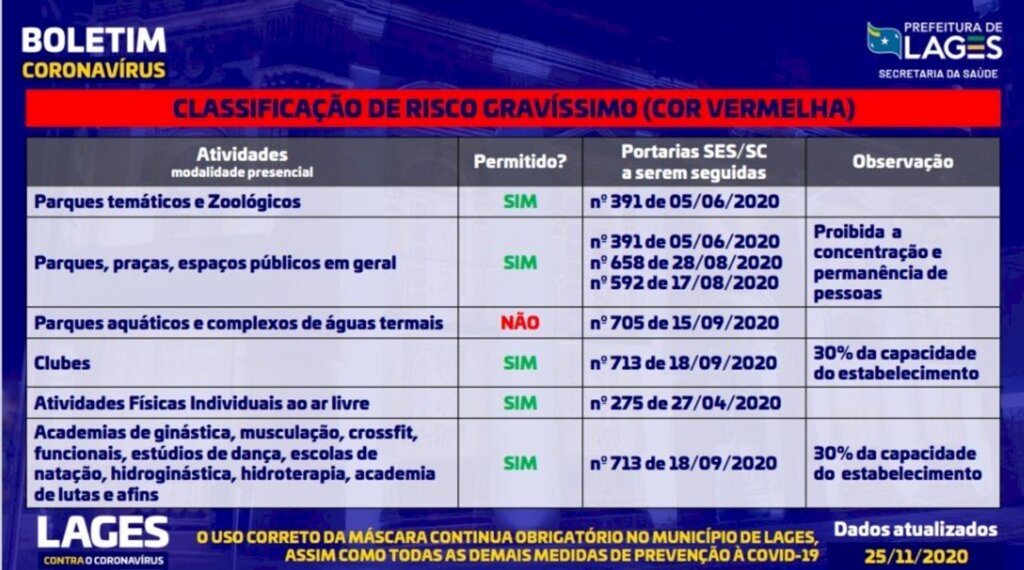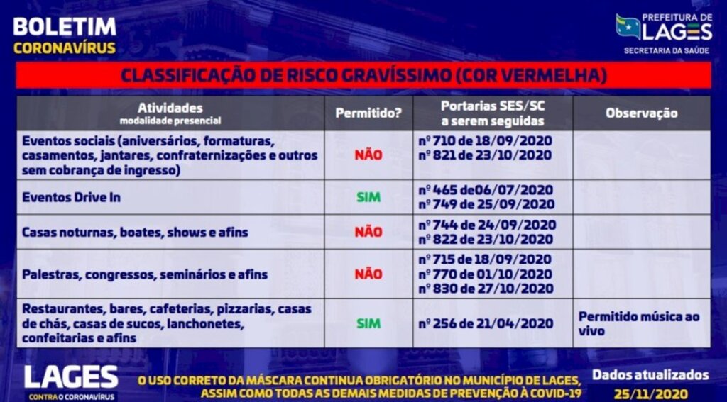A última vez que a Serra Catarinense foi enquadrada na classificação na cor Vermelha (Risco Gravíssimo), foi no mês de agosto. A partir dessa nova classificação regional, algumas medidas restritivas passam a ser adotadas no município, conforme prevê o Governo do Estado de Santa Catarina. Um novo decreto municipal, com medidas de fortalecimento da fiscalização poderá ser divulgado ainda nesta quinta-feira (26).