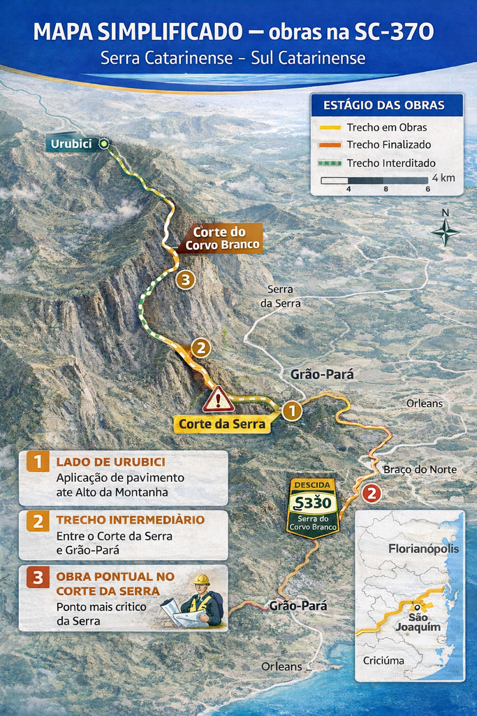 Segundo informações da Secretaria de Estado da Infraestrutura e Mobilidade (SIE), a previsão é de que o primeiro segmento, entre o centro de Urubici e o corte no topo da montanha, seja concluído até o final de fevereiro de 2026.