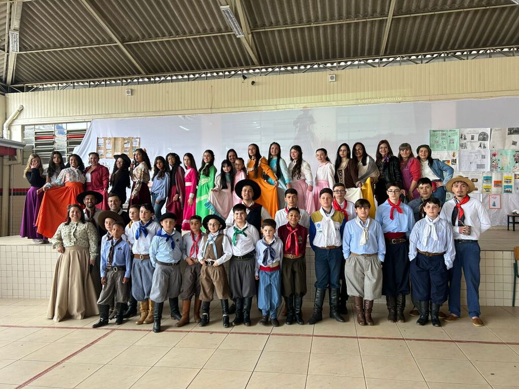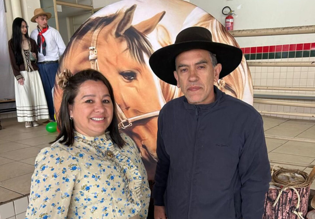 A Devolutiva da Semana Farroupilha, com um lindo projeto elaborado pela professora Mirian Santos da escola Flodoardo Cabral. Na foto, Mirian é o diretor Volmir Pedrozo